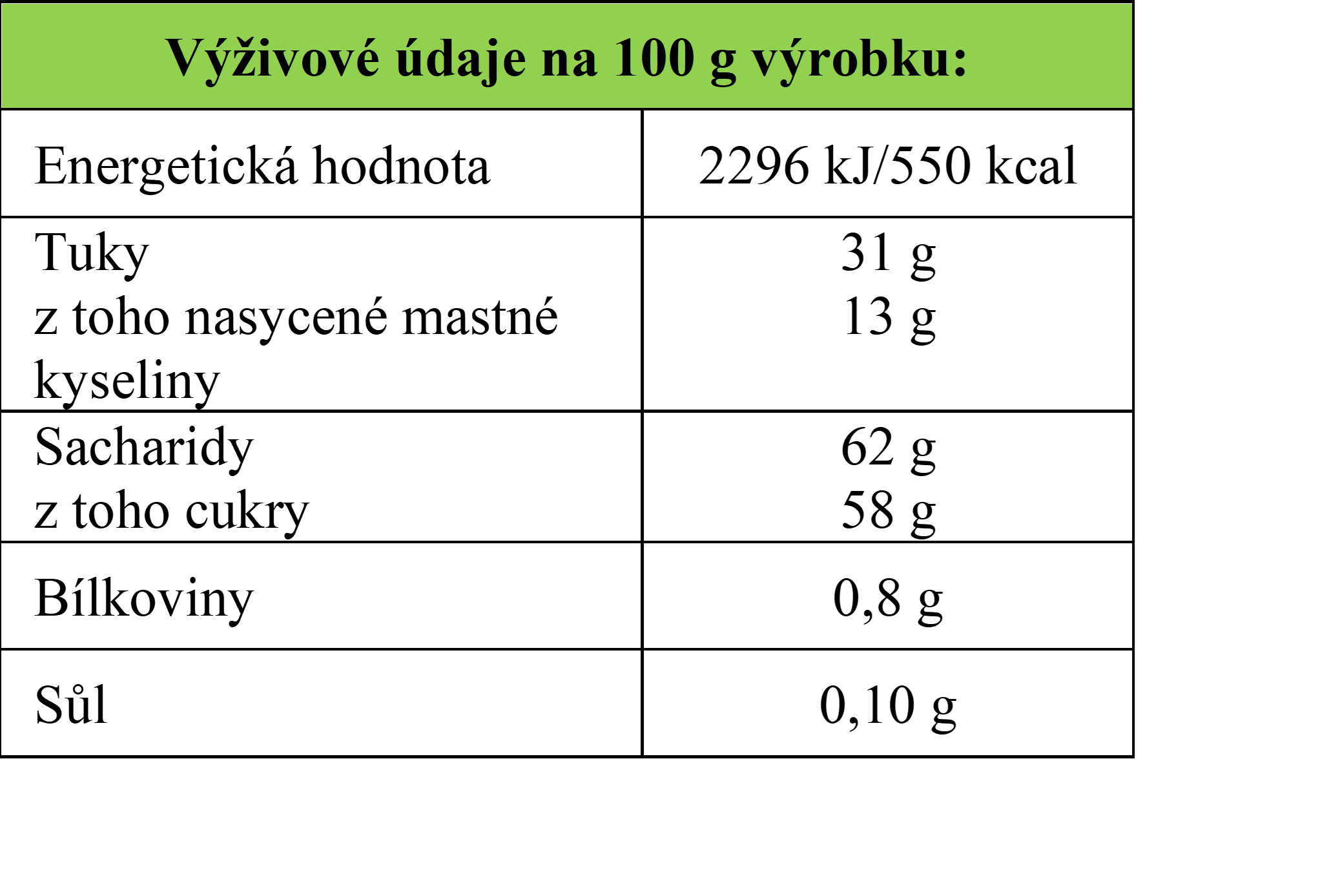Složení: cukr, náplň s příchutí nugátovou 20 % (rostlinný tuk shea, cukr moučka, kakao se sníženým obsahem tuku, sušená syrovátka, aroma nugát), kokos, pšeničné klíčky, pšeničná mouka, vaječný bílek. Výrobek může obsahovat stopy alergenu: lískové ořechy, sója, sezam.